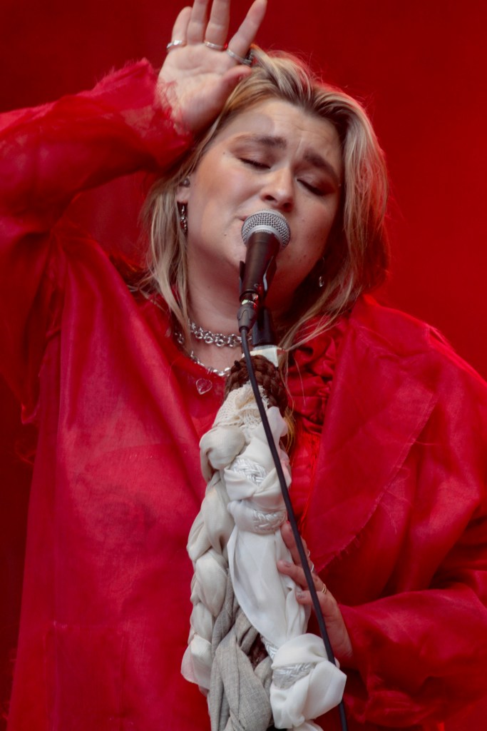 Medan hennes pappa sålde merchkläder under konserten och hennes mamma såg efter sonen, ägde Linnea våra blickar iklädd förföriskt rött och med passande scenljus strömmade hennes skönsång ut över området.
